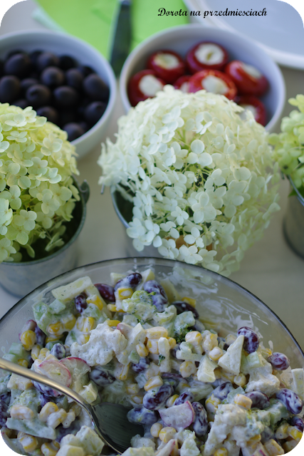 Wszystko co trzeba kroimy, doprawiamy solą i pieprzem, mieszamy z majonezem i chłodzimy