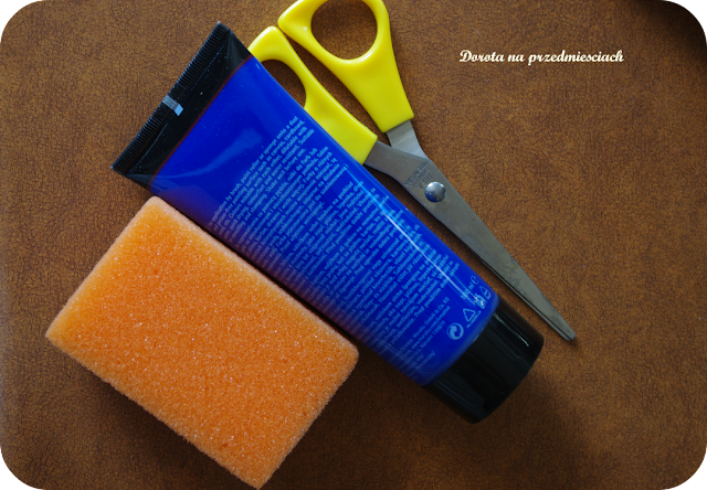 Wykorzystałam zwykłą myjkę do naczyń, farby akrylowe i nożyczki.