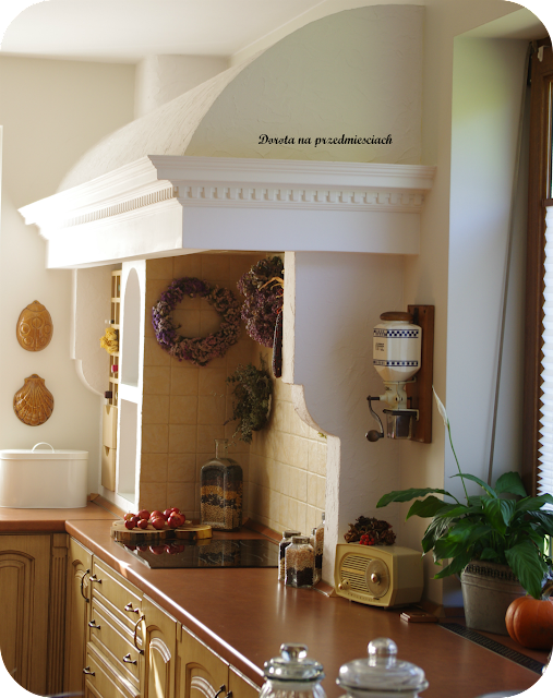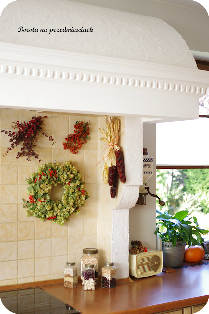 Piękna retro kuchnia i dodatki. Śliczny jest ten wianek z ziół, niesamowity! Piękna Twoja jesień w domu! 🙂 Pozdrawiam!