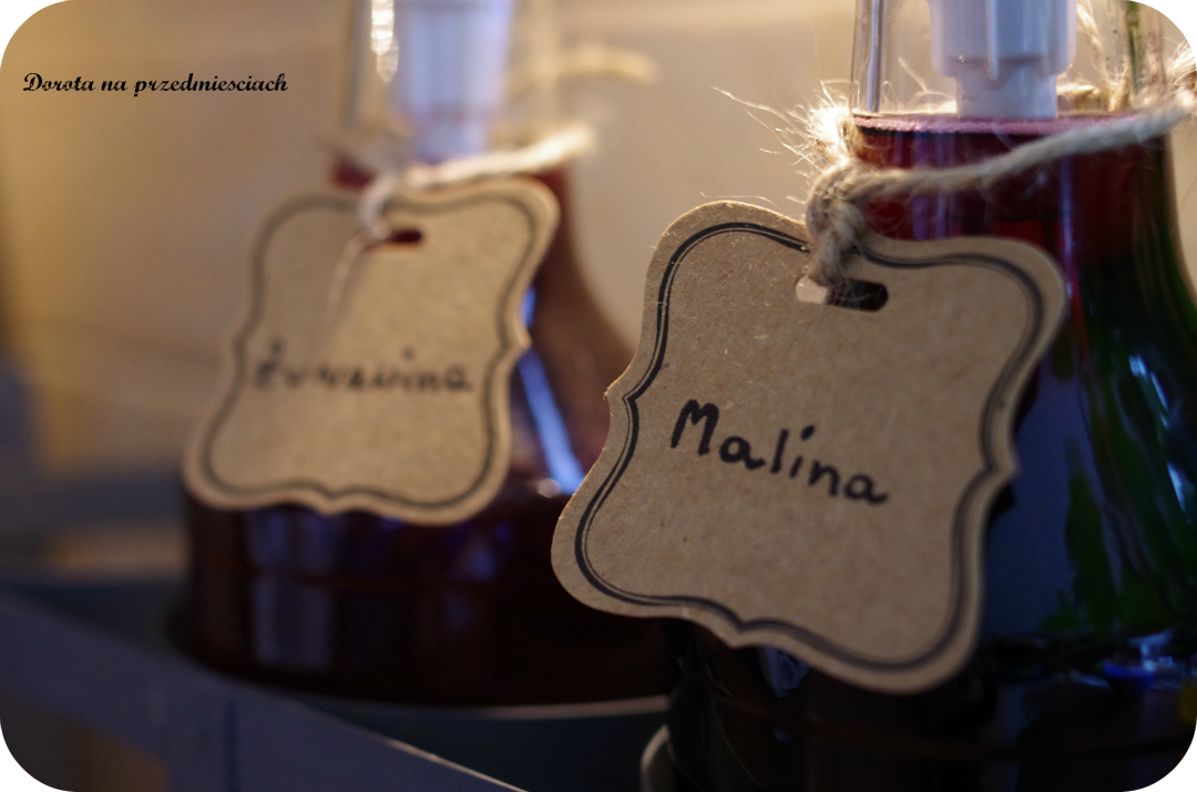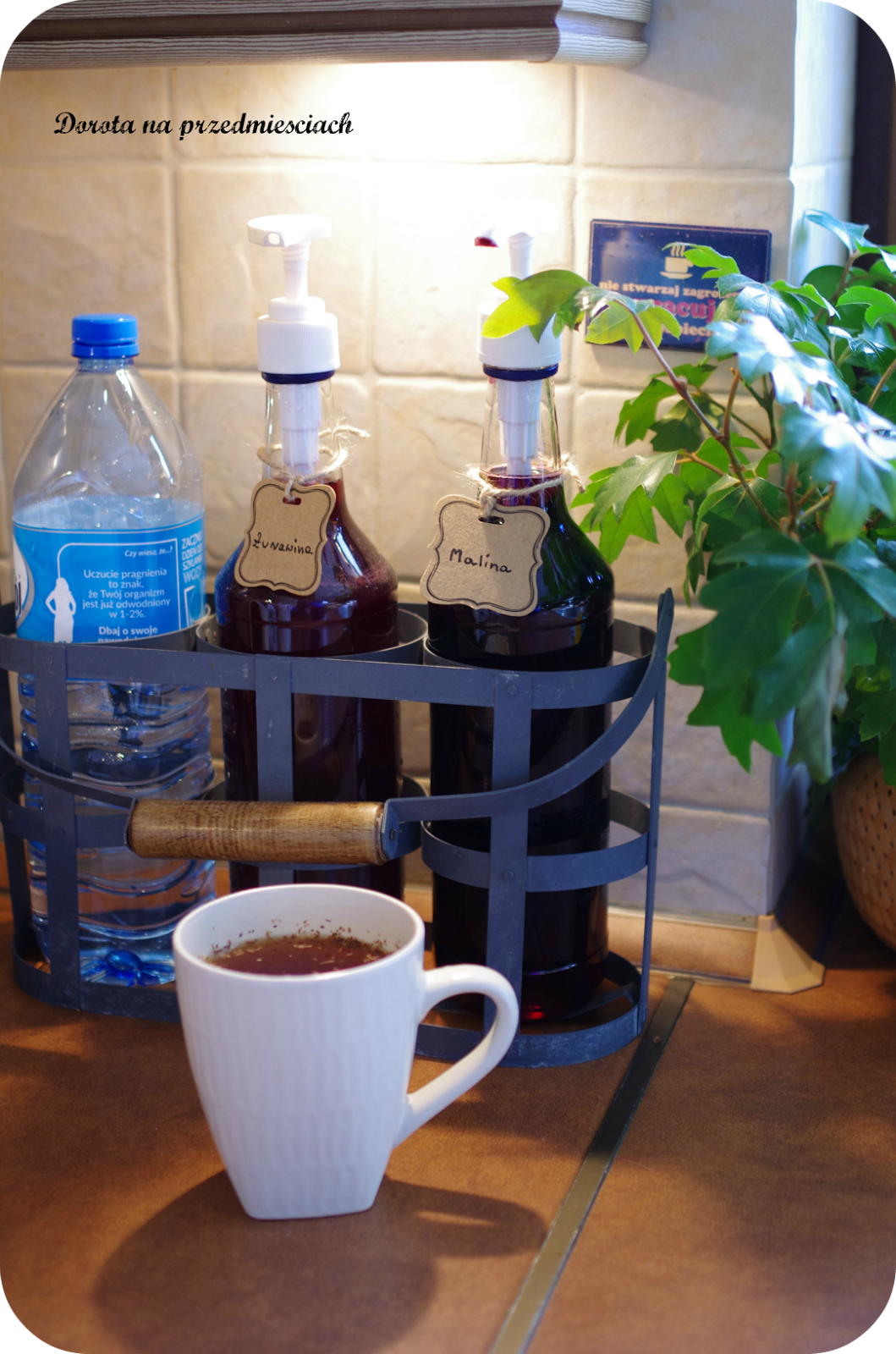 Uwielbiam herbatkę z sokiem malinowym :))Fajny pomysł z tymi dozownikami , a stojak na butelki super :))