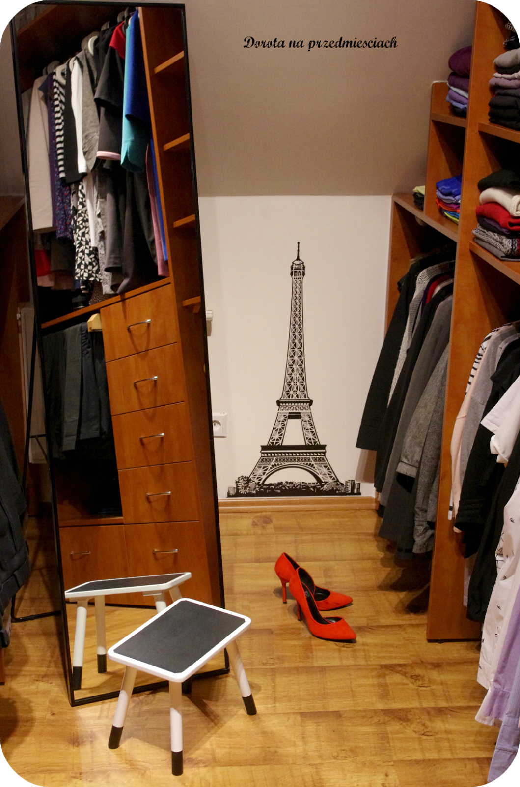 Uwielbiam przekładać, segregować, układać rzeczy w garderobie i też mam tam małą siłownię:) Czerwone szpilki sprawiły, że garderoba wygląda światowo 🙂