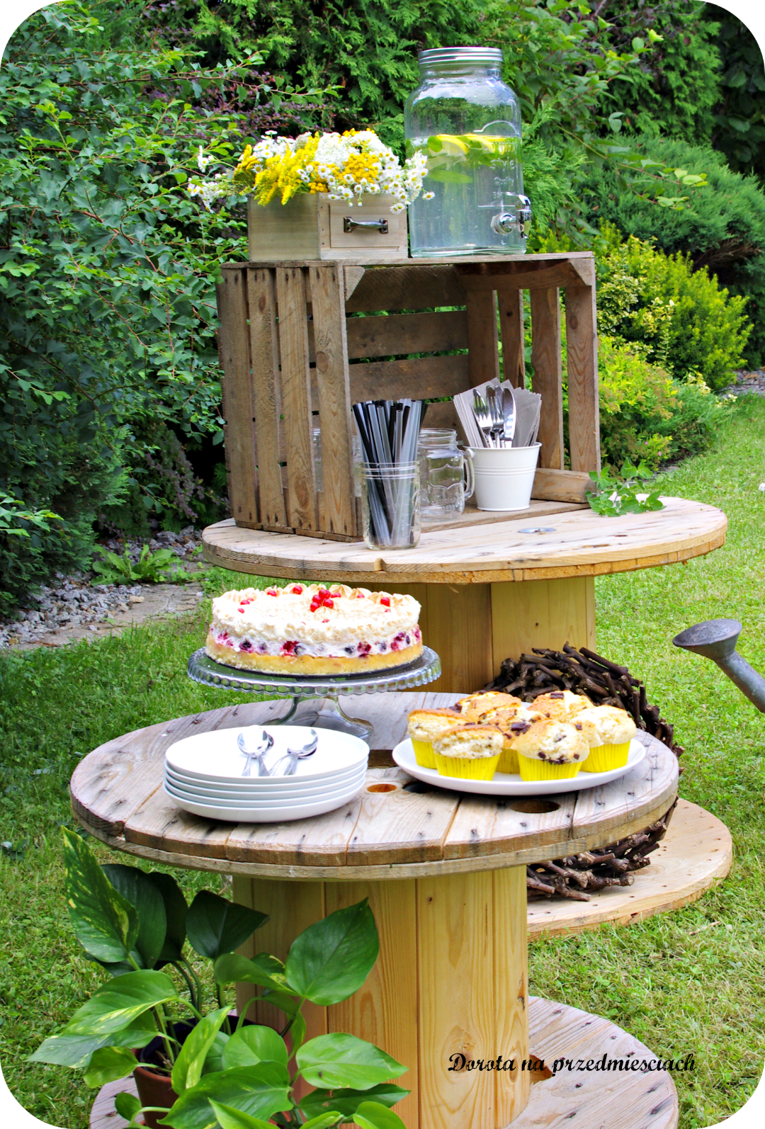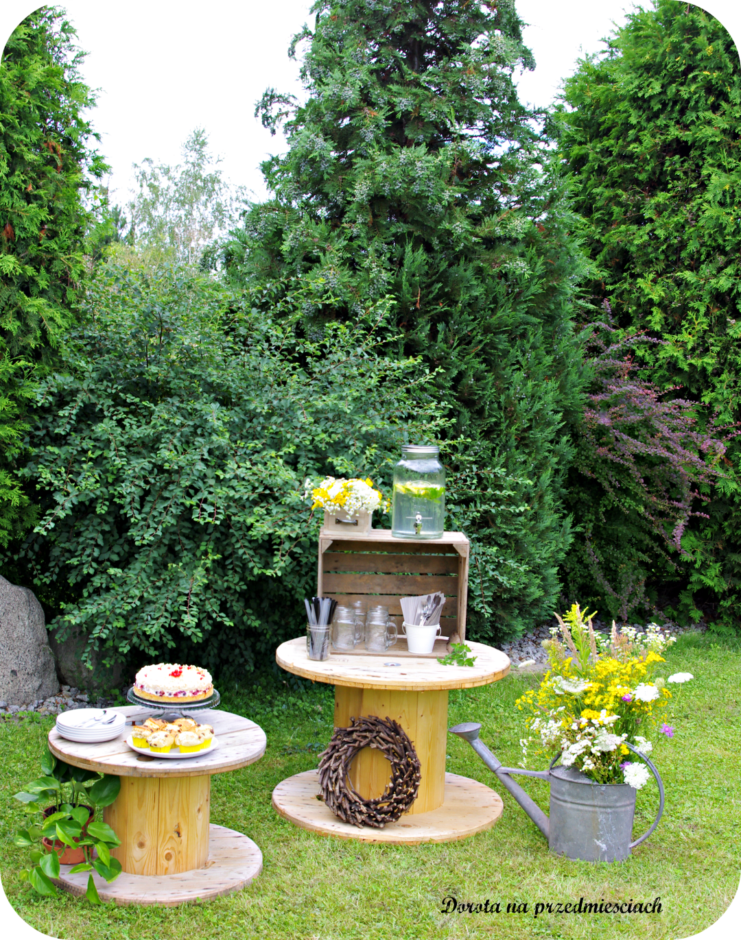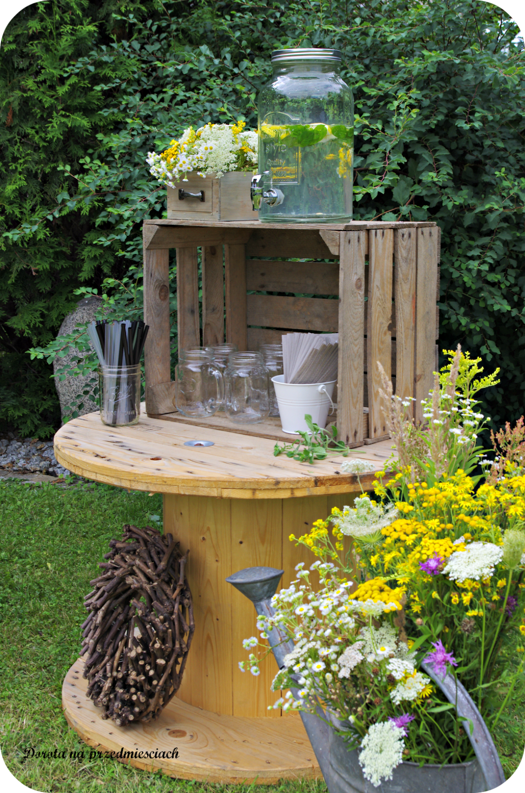Do zorganizowania kącika napojów wykorzystałam szpule po kablach.