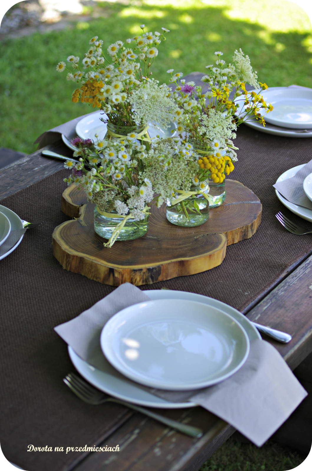 Bieżnik z juty, plater drzewa, puste słoiki  i stół już nakryty 🙂