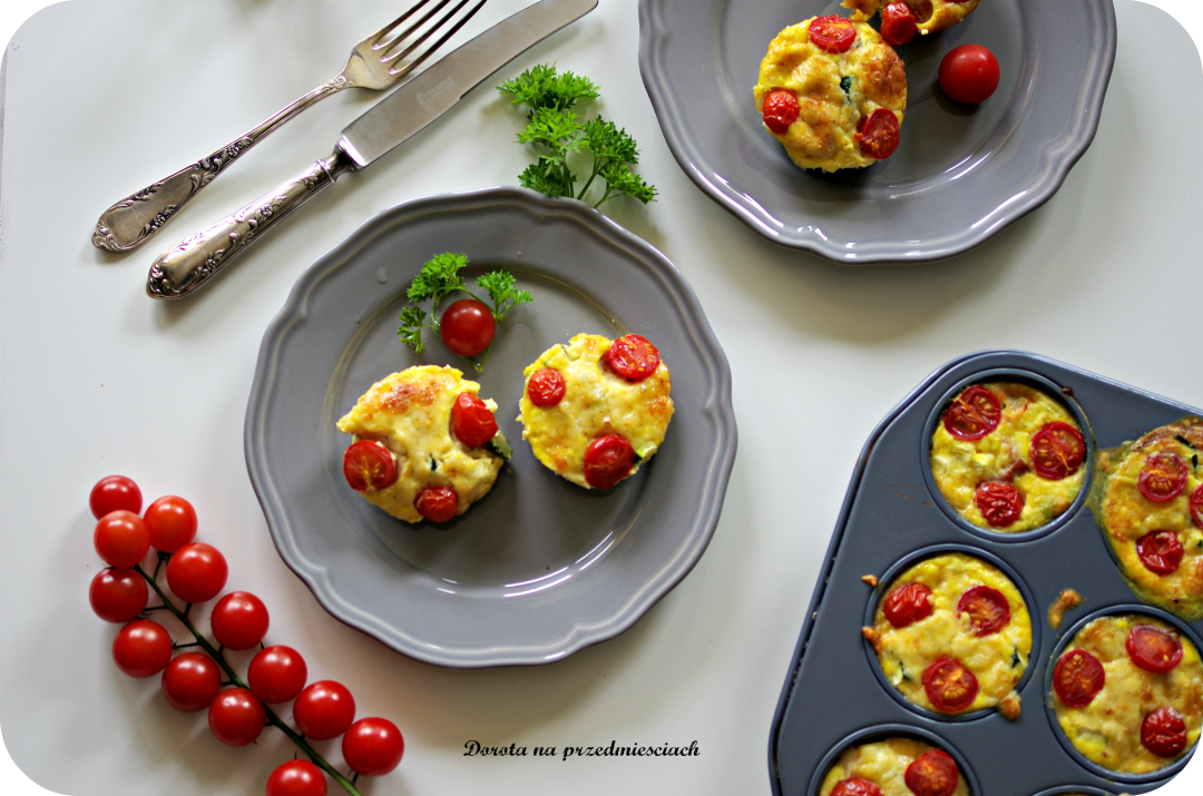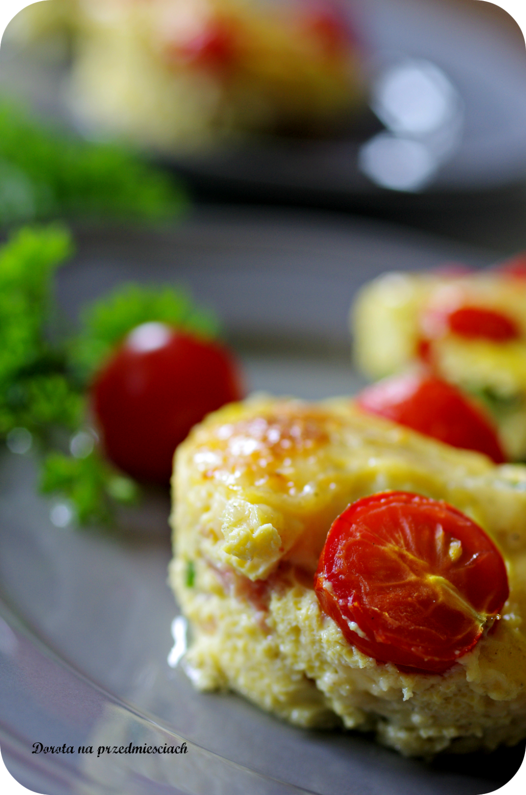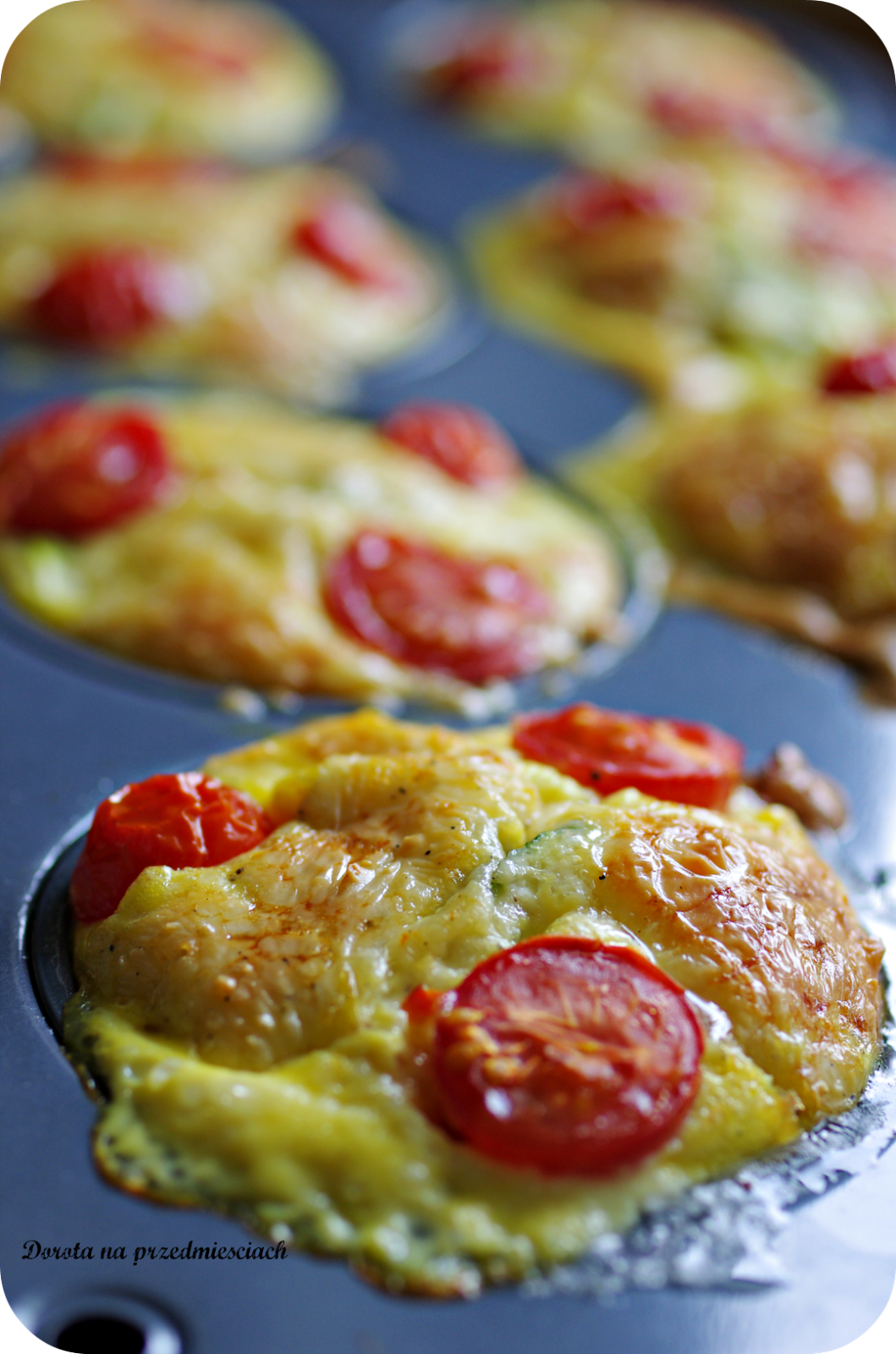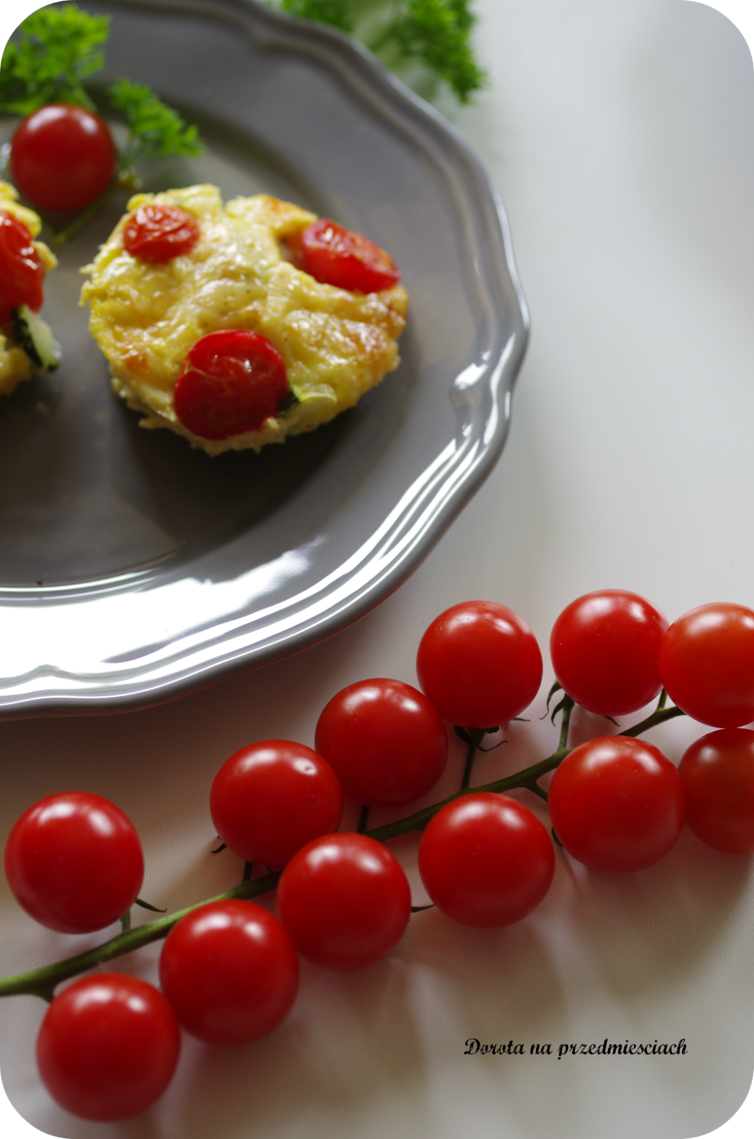 W misce wymieszaj jajka, ser, mleko wraz z solą i pieprzem. Następnie dodaj pokrojony boczek i warzywa. Mieszankę przelej do foremki na muffinki. Na wierzchu ułóż przekrojone na pół pomidorki koktajlowe .
