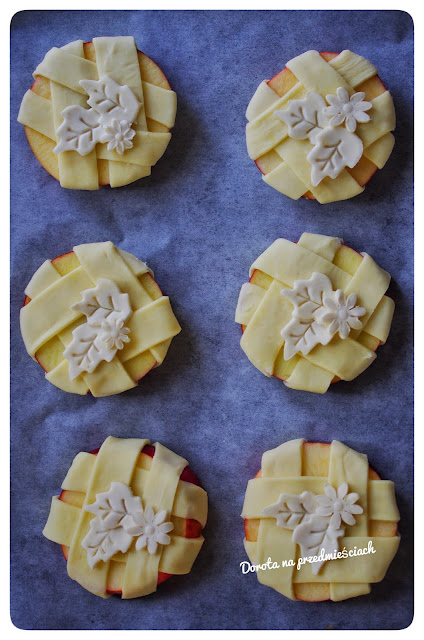 Ciasto delikatnie rozwałkowujemy i kroimy w paski. Owijamy jabłka pazkami wg wzoru lub własnej fantazji. Smarujemy roztrzepanym jajkiem, posypujemy cynamonem.