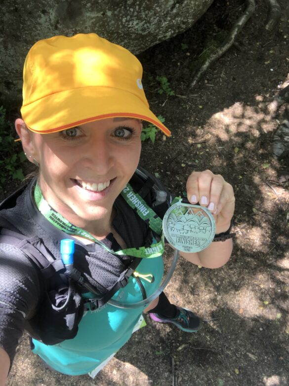 Zacznijmy od tego, że po zawirowaniach covidowych meta zawodów wróciła na swoje miejsce czyli na Szczeliniec Wielki. Miałam okazję już biec taką edycję zimową i bardzo dobrze ja wspominam. Tym razem ostrzyłam sobie zęby na te ostatnie metry po schodach w górę. Ale nim wisienka na torcie to przed biegaczami jeszcze 23 km niełatwej trasy, z przewyższeniami +/- 1075m. Zegarek pokazał mi sumę 1944m w tym więcej pod górę! Dla mnie ewidentnie druga część trasy trudniejsza szczególnie, że na wielu innych biegach charakterystyczny profil trasy to około 10 km w górę, z jakimś najwyższym punktem a potem mniej lub bardziej w dół aż do mety. No ale ten bieg jest wyjątkowy.